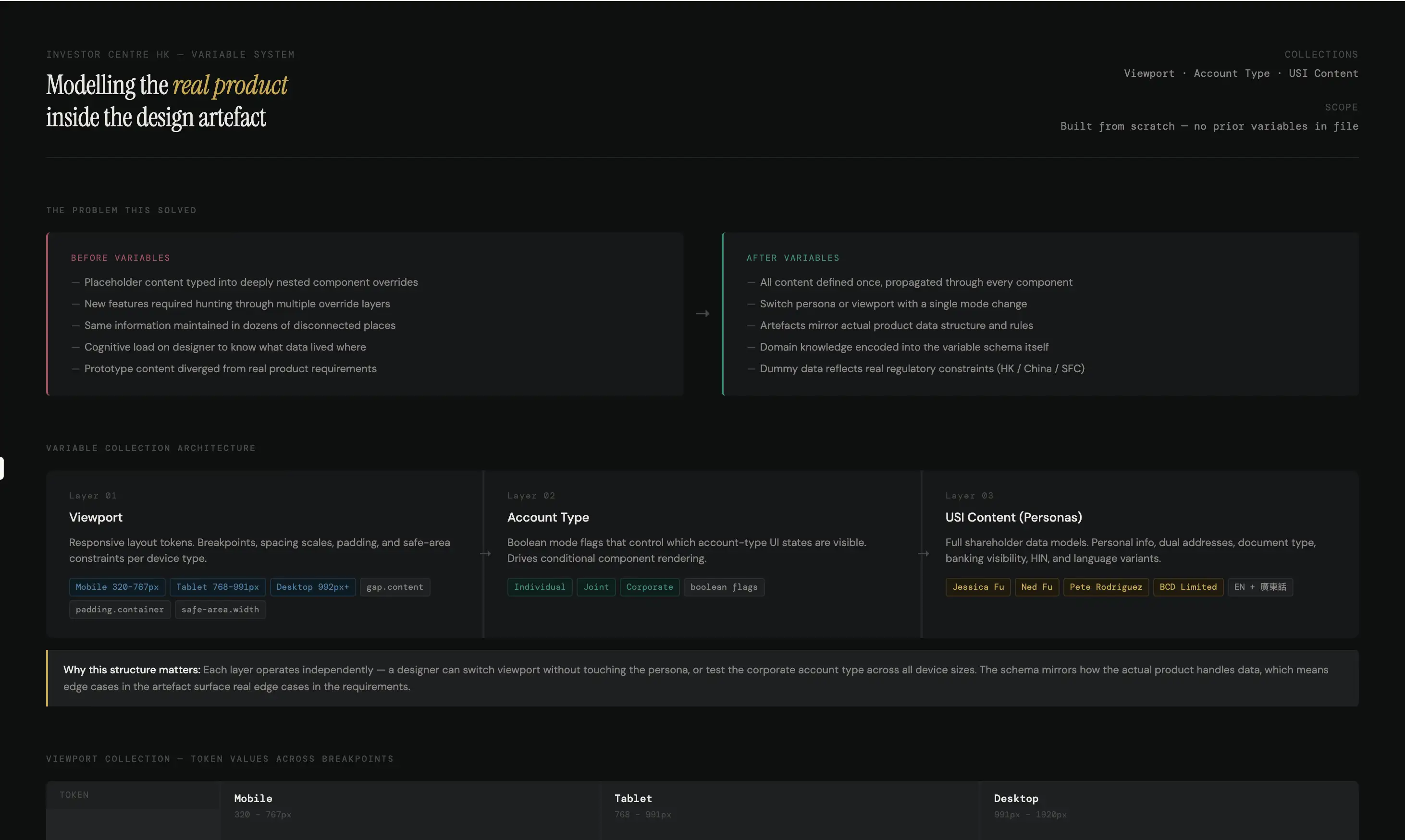 UX work on Investor Centre HK was organised around individual features. Over time, this created a product where shared journeys cannibalized each other, incremental changes caused regressions elsewhere, and no one could confidently say which artefacts were still current.