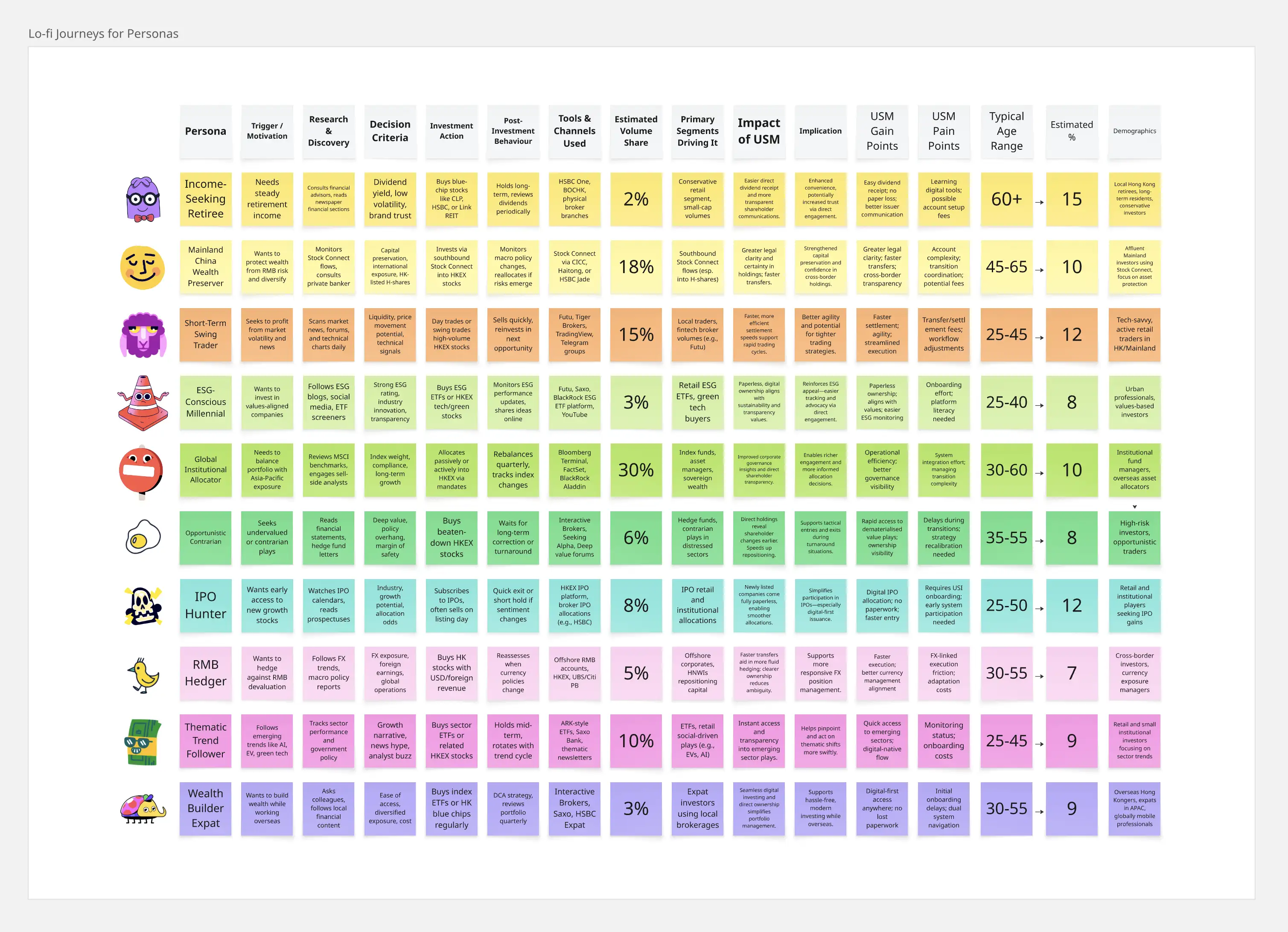 Investor segments mapped across USM pain points, gain points, and market share — informing blueprint and journey decisions.